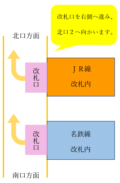 名鉄改札口からは、右方向に進んでいただき、北出口2より線路沿いに徒歩4分です。