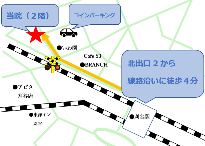当院では、JR東海道本線、名鉄三河線の刈谷駅の北出口2より線路沿いに徒歩4分の場所にあります。